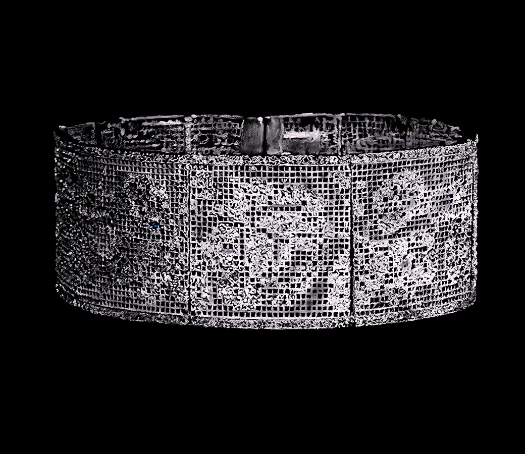 このジュエリーは、プティ・ポワンの刺繍を表現した、精緻なオープンワークの格子細工が見事に施されているブレスレット兼チョーカーです。