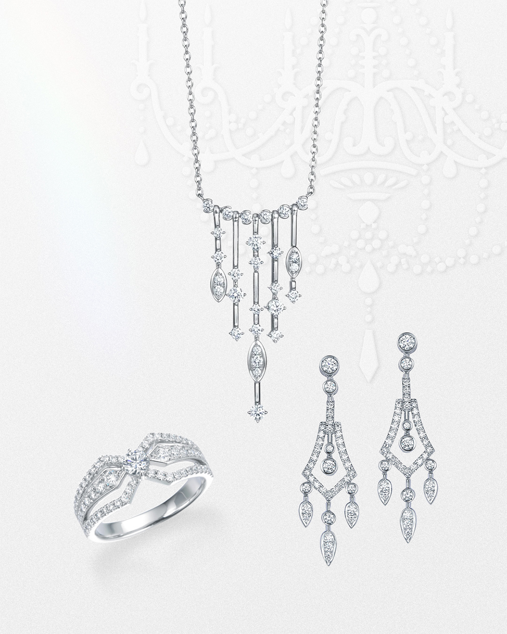 「シャンデリアシリーズ」は、古い宮殿や教会のシャンデリアから着想を得た揺れるダイヤモンドが、繊細な輝きを放ち装いに華やかさと気品を添える。