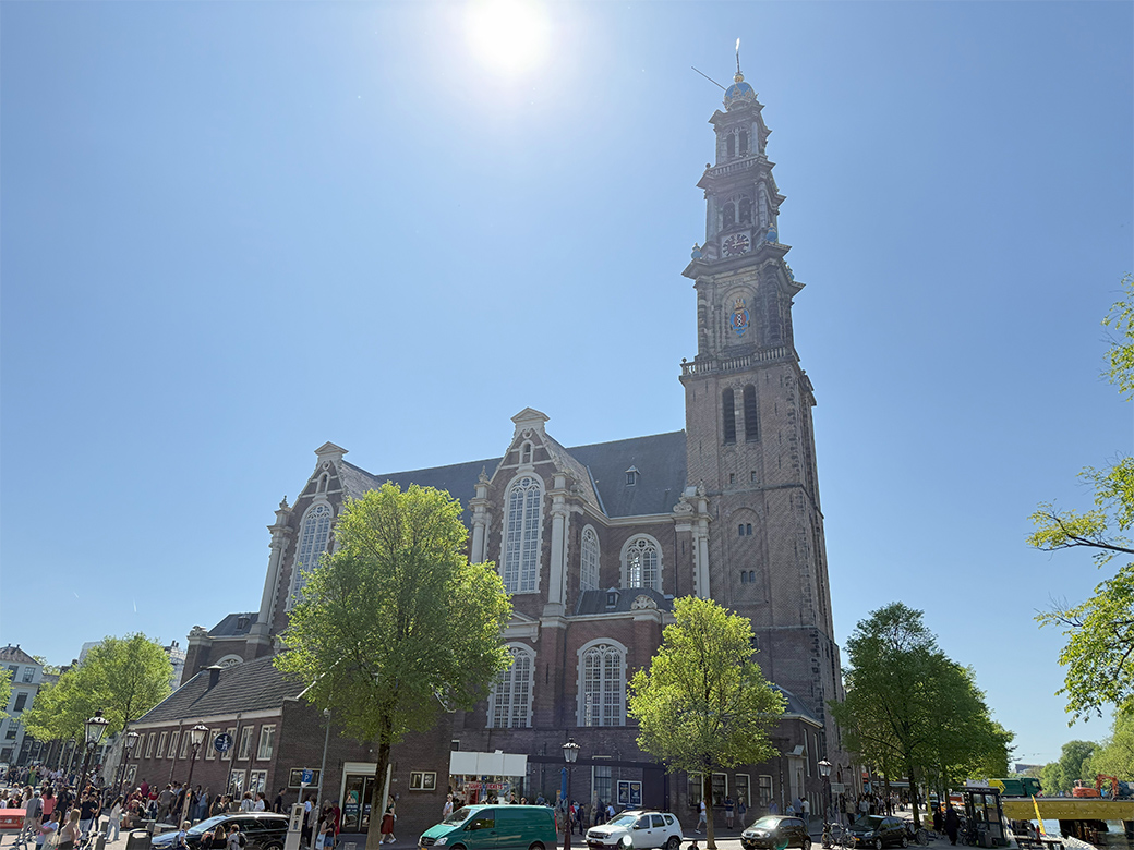 17世紀前半に建設された「西教会(Westerkerk)」はアムステルダムで最も高い85mの塔と、赤レンガと石装飾によるオランダ・ルネサンス様式の外観を備える。