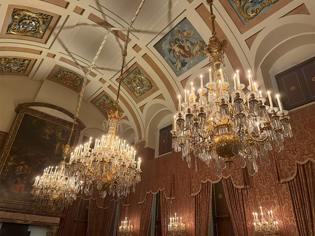 大理石の床や天井画、フランス製のシャンデリアを配した内装はきわめて華やかで、迎賓の場としての格式を備えつつ、都市の繁栄の象徴となっている。