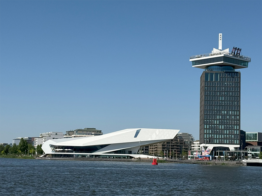 2012年、アムステルダム北岸に建設された「アイ フィルム ミュージアム(Eye Film Museum)」は、オーストリアの建築事務所「DMAA」による設計で、かつての工業地帯を再開発したエリアに建てられた。白いアルミニウム調の外観に鋭角のフォルムを用い、光と動きを建築で表現している。映画の保存や上映に加え、展示やワークショップを通じて映像文化を発信する場となっている。