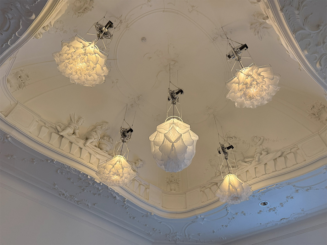 アムステルダム国立美術館には、アムステルダム拠点のデザインユニット「Studio Drift」による光のインスタレーションが展示されている。オーガニックシルクを重ねた照明が上下に揺れ、花のように開閉する姿は、空中に生命感のあるリズムをもたらしている。