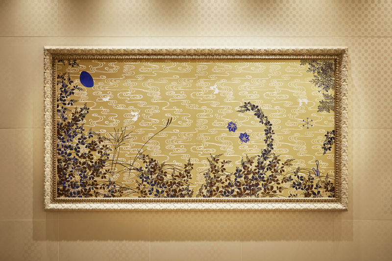 シャンパンゴールドに染めた地に煌めく流水に、光悦文様を組み合わせた上に、四季のモチーフを潜めた長右衛門独自の画風となる文様四季図は、萩や芒、月などが描かれていることから、一見は秋景色のように見える。しかし、よく見ると、蕨や桜、楓、雪花などの四季が潜んでいることに気づく。陰影が揺らぎ、うつろう流水は、時間軸、時間の流れを表している。