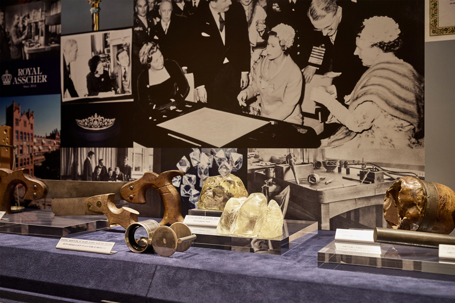 2階フロアの奥へ進むと、ロイヤル・アッシャーの歴史とクラフツマンシップを体感できる空間が広がります。当時、世界一と呼ばれていた3代目ジョセフ・アッシャーが手掛けた世界最大のダイヤモンド原石「カリナン(3,106ct)」のレプリカや、100年以上前に実際に使用されていたカッティングツールを展示。受け継がれてきた卓越した技術と、その輝きの源を感じていただける特別なエリアです。